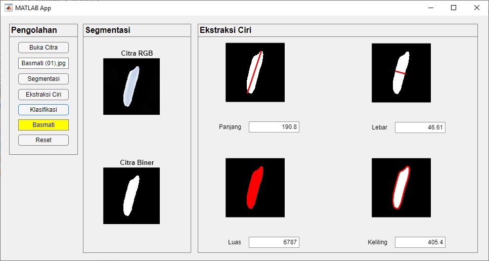 Dalam penelitian ini, kami berhasil mengimplementasikan algoritma Jaringan Syaraf Tiruan Backpropagation untuk klasifikasi citra beras berdasarkan ekstraksi ciri bentuk panjang, lebar, luas, dan keliling. Hasil eksperimen menunjukkan akurasi yang cukup baik dalam mengklasifikasikan jenis-jenis beras yang diteliti. Meskipun terdapat potensi untuk pengembangan lebih lanjut, penelitian ini memberikan kontribusi dalam pengaplikasian teknologi kecerdasan buatan dalam bidang pertanian dan pengolahan citra.