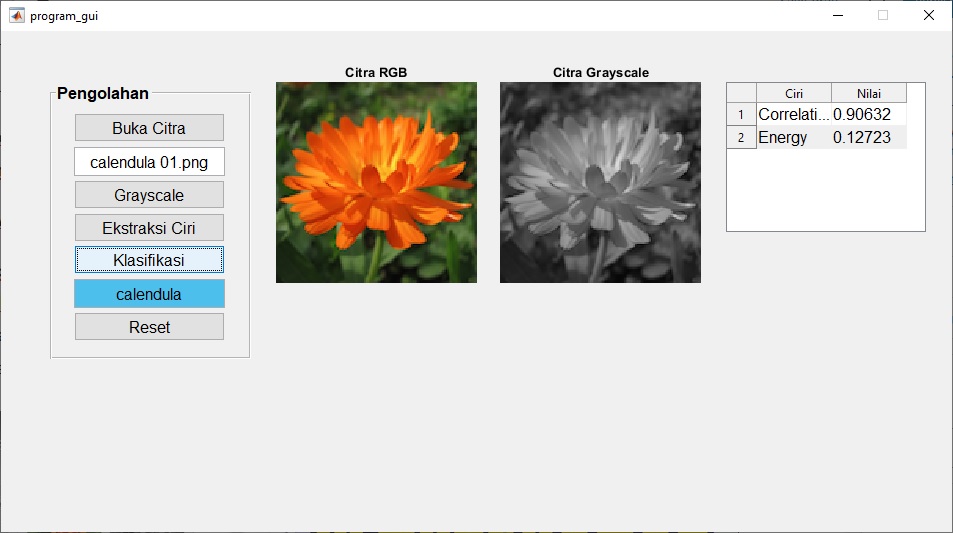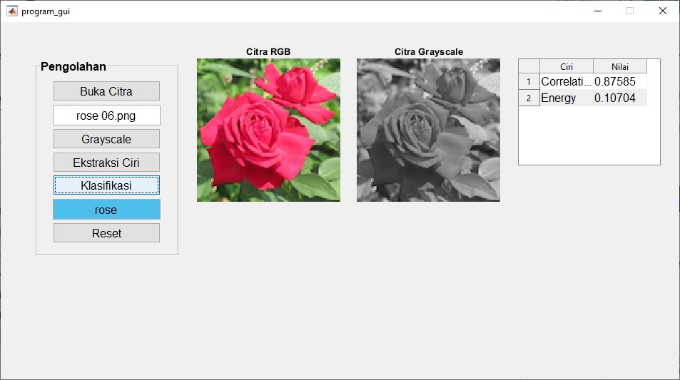 Citra bunga diolah menggunakan metode ekstraksi ciri GLCM. GLCM menggambarkan hubungan antara dua piksel dalam citra, mengukur seberapa sering pasangan intensitas piksel muncul bersama dalam suatu jarak dan arah tertentu. Ciri-ciri seperti kontras, energi, homogenitas, dan korelasi diekstrak dari matriks GLCM untuk mewakili tekstur citra.