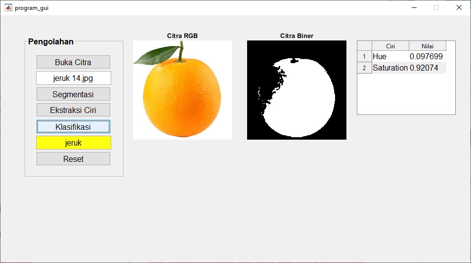 Ekstraksi ciri dilakukan dengan menghitung nilai Hue (warna) dan Saturation (kejenuhan) pada citra. Ciri-ciri ini mencerminkan karakteristik warna dari buah dalam citra.