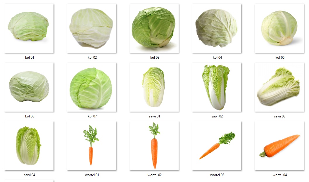 Citra sayuran diawali dengan konversi dari citra RGB menjadi citra grayscale, yang memudahkan dalam ekstraksi ciri. Kemudian, citra grayscale disegmentasi menggunakan metode thresholding untuk memisahkan objek sayuran dari latar belakang.