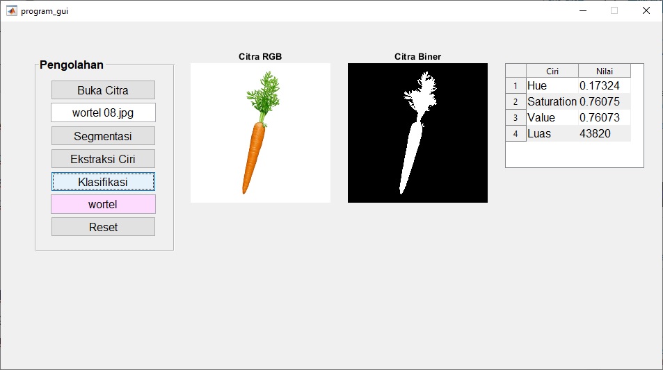 Ekstraksi ciri dilakukan dengan menghitung nilai rata-rata komponen HSV pada citra. Nilai HSV mencerminkan informasi warna dalam citra. Selain itu, luas objek juga dihitung sebagai ciri tambahan. Ciri-ciri ini memberikan representasi penting tentang karakteristik visual dari sayuran dalam citra.