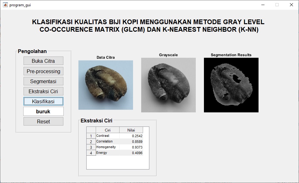 - Pelatihan dan Klasifikasi dengan K-NN: Pelatihan dilakukan dengan menggunakan 70 citra biji kopi baik dan 70 citra biji kopi buruk yang telah disegmentasi dan dihitung fitur-fiturnya. Klasifikasi K-NN dilakukan menggunakan fitur-fitur tersebut.