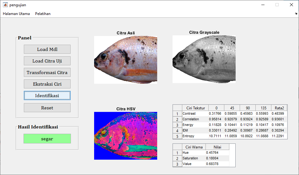Pemrograman MATLAB untuk mengidentifikasi kesegaran ikan nila menggunakan metode K-Nearest Neighbor (K-NN) dengan ekstraksi ciri tekstur GLCM (Gray Level Co-Occurrence Matrix) dan ciri warna HSV (Hue, Saturation, Value):