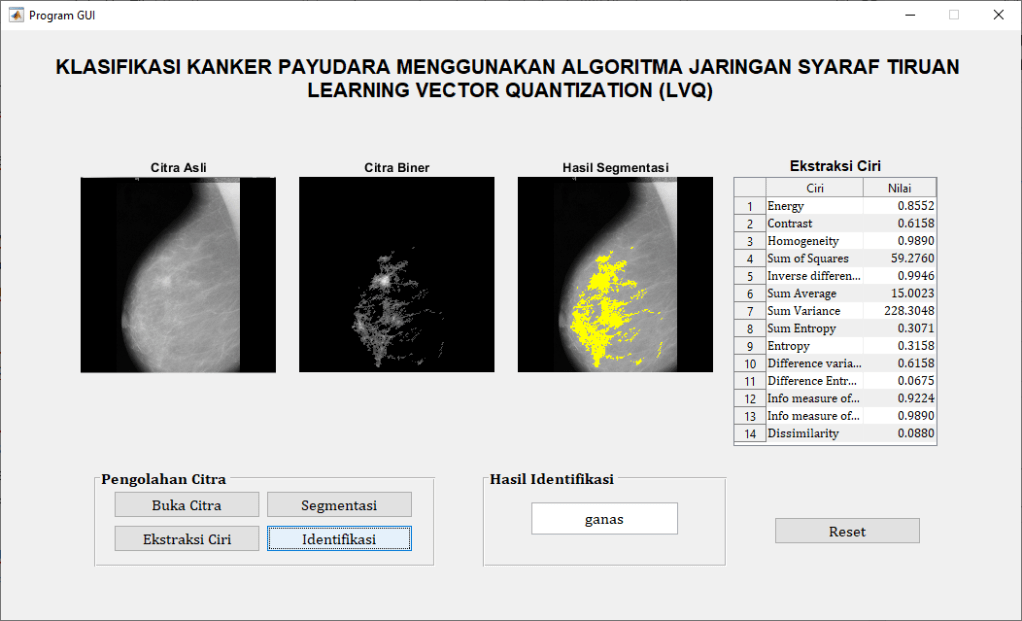 Posted on August 31, 2023, in Pengenalan Pola, Pengolahan Citra and tagged analisis citra medis, Deteksi dini kanker payudara, Deteksi Penyakit, Diagnosa Medis, ekstraksi ciri, glcm, jaringan syaraf tiruan, kecerdasan buatan, Klasifikasi Kanker, Learning Vector Quantization, pengolahan citra, segmentasi citra. Bookmark the permalink. Leave a comment.