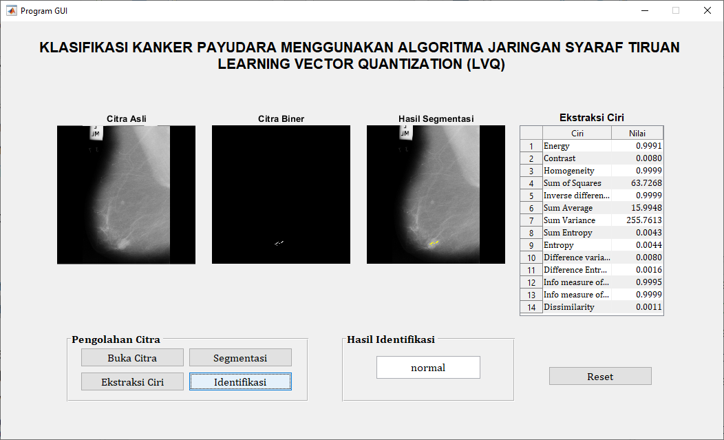 Posted on August 31, 2023, in Pengenalan Pola, Pengolahan Citra and tagged analisis citra medis, Deteksi dini kanker payudara, Deteksi Penyakit, Diagnosa Medis, ekstraksi ciri, glcm, jaringan syaraf tiruan, kecerdasan buatan, Klasifikasi Kanker, Learning Vector Quantization, pengolahan citra, segmentasi citra. Bookmark the permalink. Leave a comment.