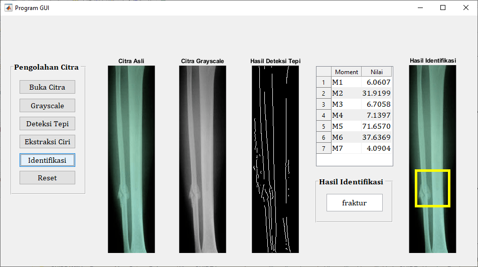 Setelah citra telah di-segmentasi dengan benar, kita dapat melanjutkan dengan ekstraksi ciri. Moment invariant adalah salah satu metode ekstraksi ciri yang berguna dalam menggambarkan bentuk objek pada citra. Metode ini menghasilkan serangkaian nilai yang tidak berubah terhadap perubahan dalam skala, rotasi, atau translasi objek. Ini adalah fitur yang berguna untuk membedakan fraktur tulang dari struktur tulang normal.