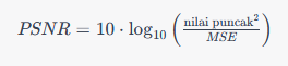PSNR adalah metrik yang mengukur kualitas citra dengan membandingkan sinyal maksimum (nilai puncak) dengan tingkat noise dalam citra. Rumusnya adalah: