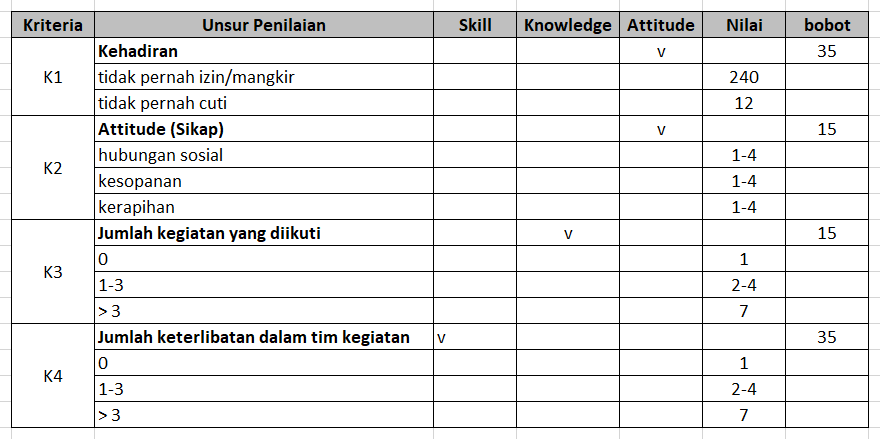 - Identifikasi Kriteria Penilaian: Langkah pertama dalam penggunaan SAW dalam penilaian kinerja karyawan adalah mengidentifikasi kriteria yang akan digunakan untuk menilai karyawan. Kriteria ini dapat mencakup hal-hal seperti produktivitas, kemampuan berkolaborasi, inisiatif, kepatuhan terhadap peraturan, dan banyak lagi.
