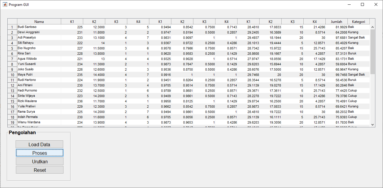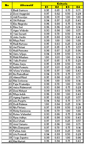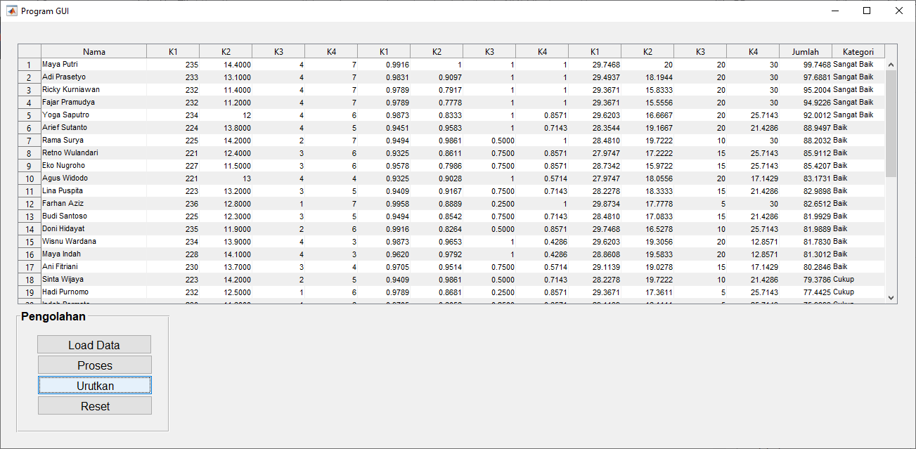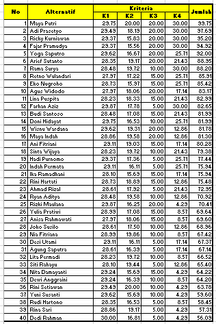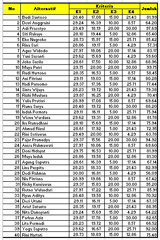 - Perhitungan Skor Kinerja: Skor kinerja untuk setiap karyawan dihitung dengan mengalikan nilai masing-masing kriteria dengan bobotnya, kemudian menjumlahkan semua hasilnya. Karyawan dengan skor tertinggi dianggap memiliki kinerja terbaik.
