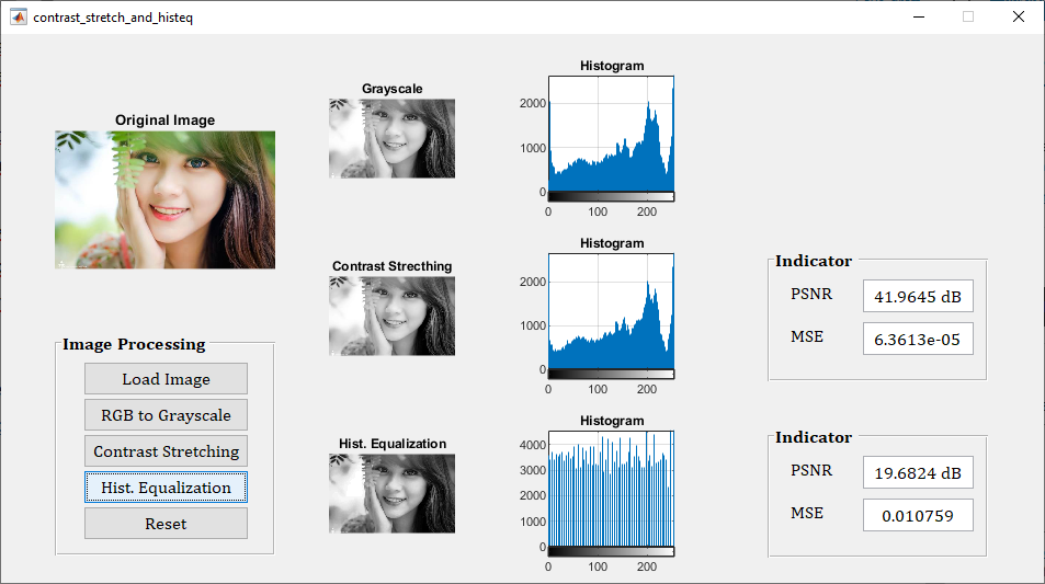Berikut adalah pemrograman MATLAB untuk Contrast Stretching dan Histogram Equalization pada citra digital: