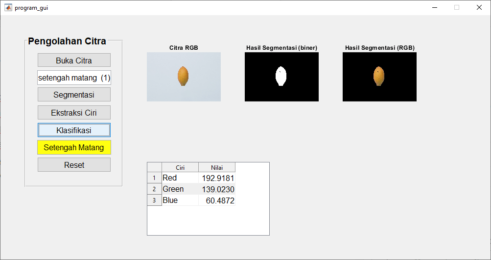 - Hitung nilai rata-rata komponen warna (R, G, dan B) dari buah melinjo yang telah di-segmentasi pada langkah sebelumnya.