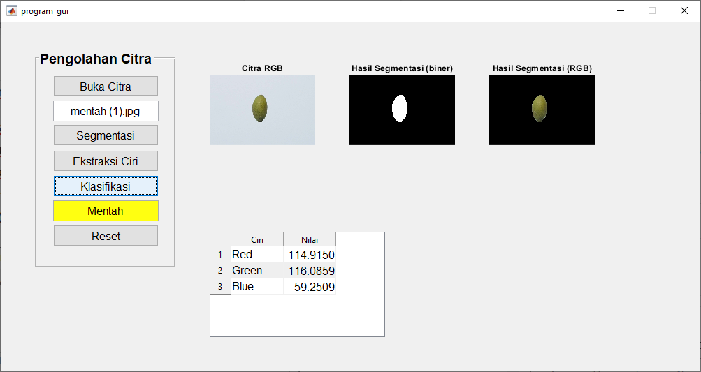 - Hitung nilai rata-rata komponen warna (R, G, dan B) dari buah melinjo yang telah di-segmentasi pada langkah sebelumnya.