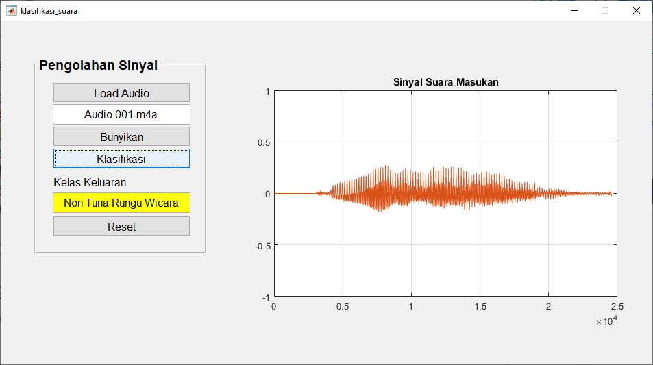 - Gunakan model SVM yang telah dilatih untuk mengklasifikasikan suara ini sebagai tuna rungu wicara atau non-tuna rungu wicara berdasarkan ciri-ciri MFCC-nya.