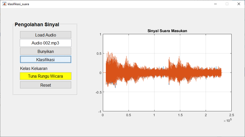 - Gunakan model SVM yang telah dilatih untuk mengklasifikasikan suara ini sebagai tuna rungu wicara atau non-tuna rungu wicara berdasarkan ciri-ciri MFCC-nya.