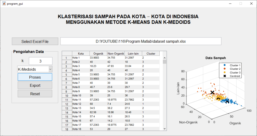 Krisis sampah adalah masalah serius yang dihadapi oleh banyak kota di seluruh dunia, termasuk di Indonesia. Dengan pertumbuhan populasi dan urbanisasi yang pesat, manajemen sampah yang efisien menjadi semakin penting. Salah satu langkah awal dalam meningkatkan manajemen sampah adalah memahami pola dan karakteristik sampah di berbagai kota. Dalam artikel ini, akan dijelaskan bagaimana metode klasterisasi, khususnya K-Means dan K-Medoids, dapat digunakan untuk mengelompokkan data sampah dari 287 kota di Indonesia berdasarkan komposisinya.