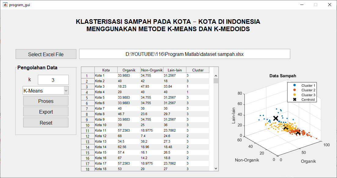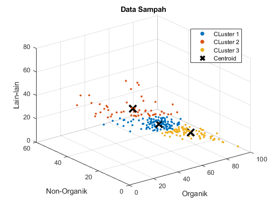 Data sampah yang kami gunakan dalam analisis ini mencakup 287 kota di seluruh Indonesia. Setiap data kota terdiri dari tiga atribut utama yang merupakan persentase komposisi sampah: