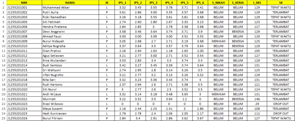 - Indeks Prestasi Sementara (IPS): Nilai rata-rata sementara mahasiswa selama studi mereka.
