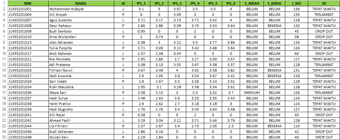 Selain itu, kita memiliki variabel target yang akan kita prediksi, yaitu Status Kelulusan, yang dapat memiliki tiga nilai, yaitu “Tepat Waktu,” “Terlambat,” atau “Drop Out.”