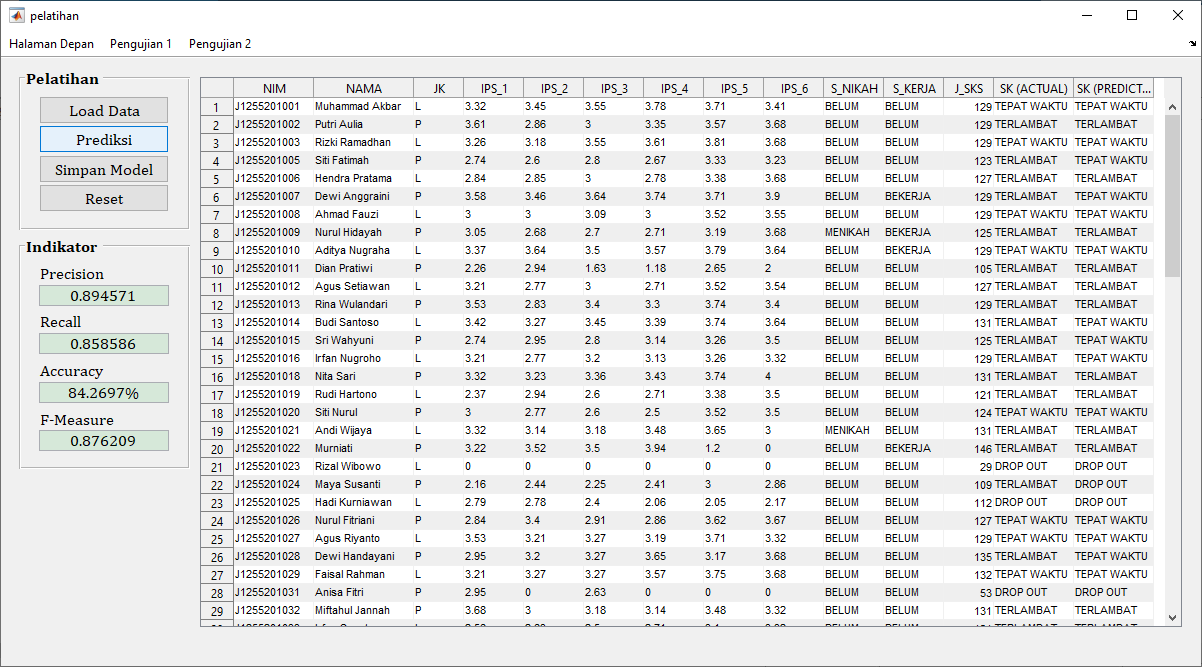 - Evaluasi Model: Model yang telah dilatih dievaluasi dengan menggunakan data pengujian untuk mengukur sejauh mana model tersebut dapat memprediksi status kelulusan dengan akurasi.