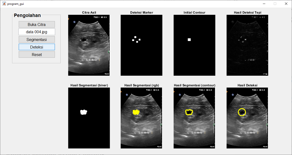 Segmentasi citra kista ginjal menggunakan metode active contour berdasarkan citra ultrasonografi adalah salah satu cara yang efektif untuk mengidentifikasi dan memisahkan kista dari struktur ginjal lainnya. Metode ini melibatkan deteksi tepi, inisialisasi contour, dan proses iteratif untuk memperbaiki posisi contour agar sesuai dengan tepi kista. Hasil segmentasi ini dapat digunakan untuk diagnosis medis lebih lanjut dan perencanaan pengobatan. Dengan teknologi ini, kita dapat meningkatkan deteksi dini dan pengelolaan penyakit ginjal, termasuk kista ginjal, yang akan berdampak positif pada kesehatan pasien.