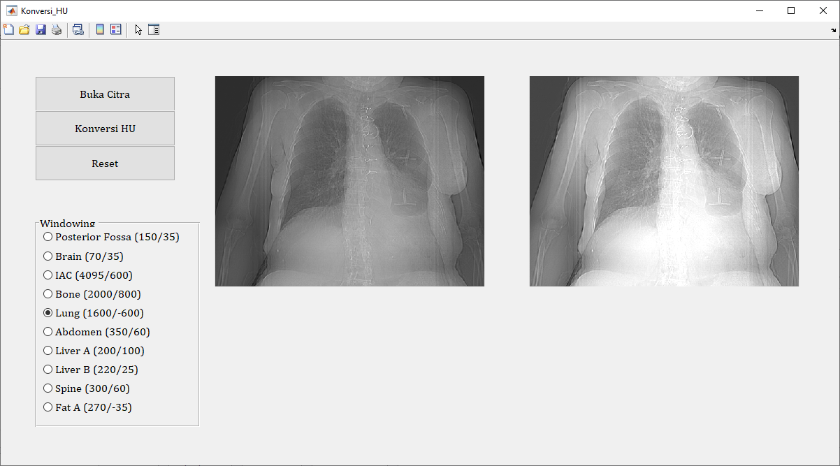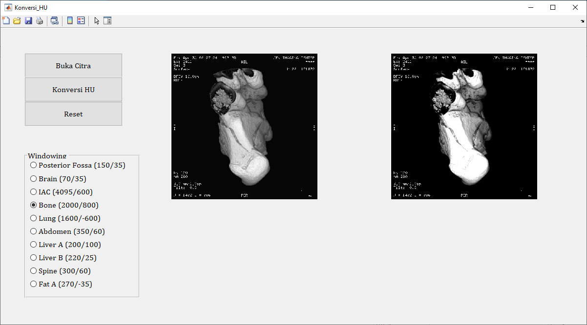 Mari kita lihat bagaimana kita dapat melakukan konversi intensitas piksel citra ke HU menggunakan Matlab. Langkah-langkahnya meliputi: