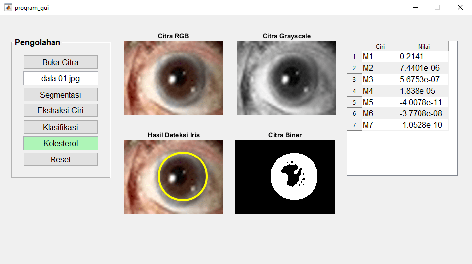 Tingginya kadar kolesterol dalam tubuh dapat menjadi faktor risiko utama untuk berbagai penyakit jantung dan pembuluh darah. Oleh karena itu, deteksi dini dan pemantauan tingkat kolesterol menjadi sangat penting untuk menjaga kesehatan jantung. Pengolahan citra iris mata menjadi salah satu pendekatan inovatif dalam memanfaatkan kecerdasan buatan untuk mendeteksi indikasi tingginya kadar kolesterol.