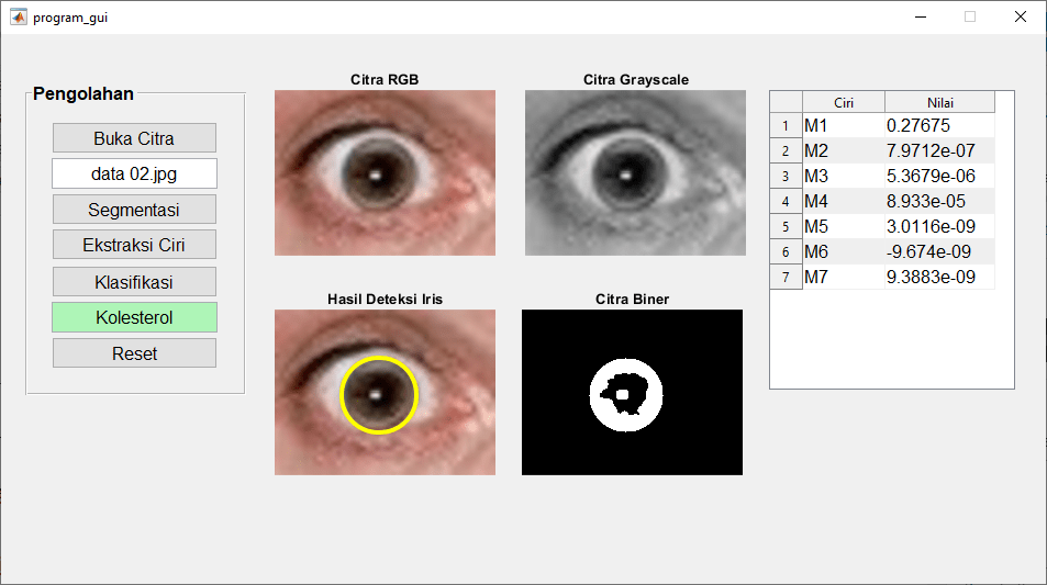Tingginya kadar kolesterol dalam tubuh dapat menjadi faktor risiko utama untuk berbagai penyakit jantung dan pembuluh darah. Oleh karena itu, deteksi dini dan pemantauan tingkat kolesterol menjadi sangat penting untuk menjaga kesehatan jantung. Pengolahan citra iris mata menjadi salah satu pendekatan inovatif dalam memanfaatkan kecerdasan buatan untuk mendeteksi indikasi tingginya kadar kolesterol.