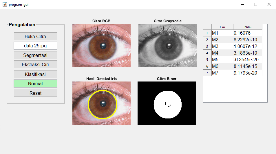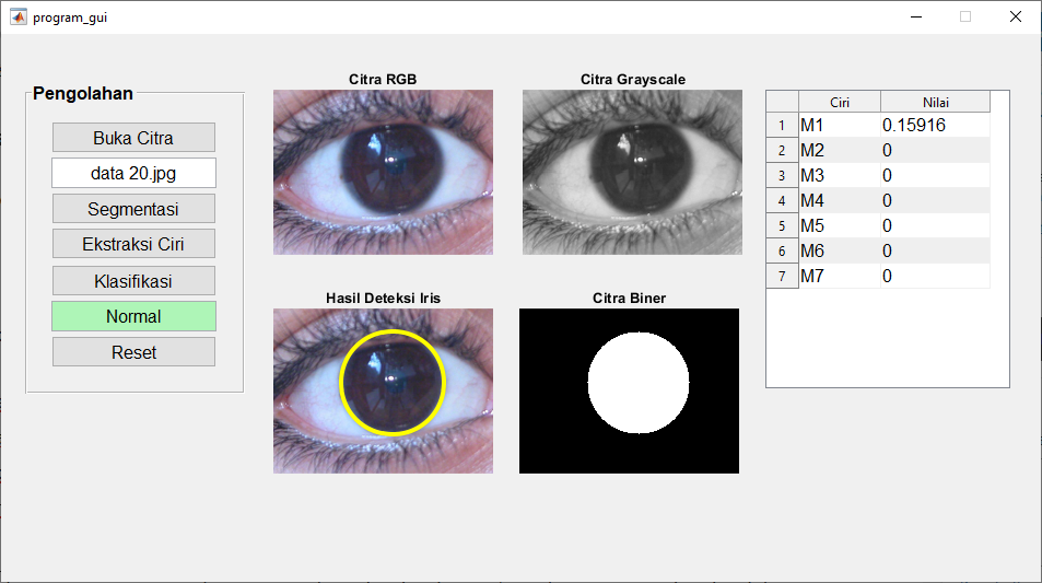 Loop ini melakukan pengolahan citra untuk setiap citra mata uji. Citra diubah ukurannya, diubah menjadi citra grayscale, dilakukan deteksi iris mata dengan metode Daugman’s integrodifferential operator, dilakukan operasi thresholding, dan dilakukan ekstraksi ciri moment invariant dari citra mata tersebut. Hasil ekstraksi ciri disimpan dalam matriks ciri_uji.
