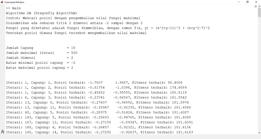 - Evaluasi Hasil: Setelah menjalankan algoritma DA, kita memperoleh posisi terbaik yang memberikan nilai maksimal dari fungsi Himmelblau. Kita membandingkan nilai fungsi pada posisi tersebut dengan nilai maksimal yang telah ditemukan.