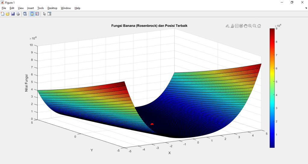 - Visualisasi Hasil: Setelah semua iterasi selesai, kita memvisualisasikan hasil simulasi menggunakan plot 3D. Hal ini memungkinkan kita untuk melihat dengan jelas bagaimana posisi terbaik terletak dalam ruang pencarian fungsi Banana.