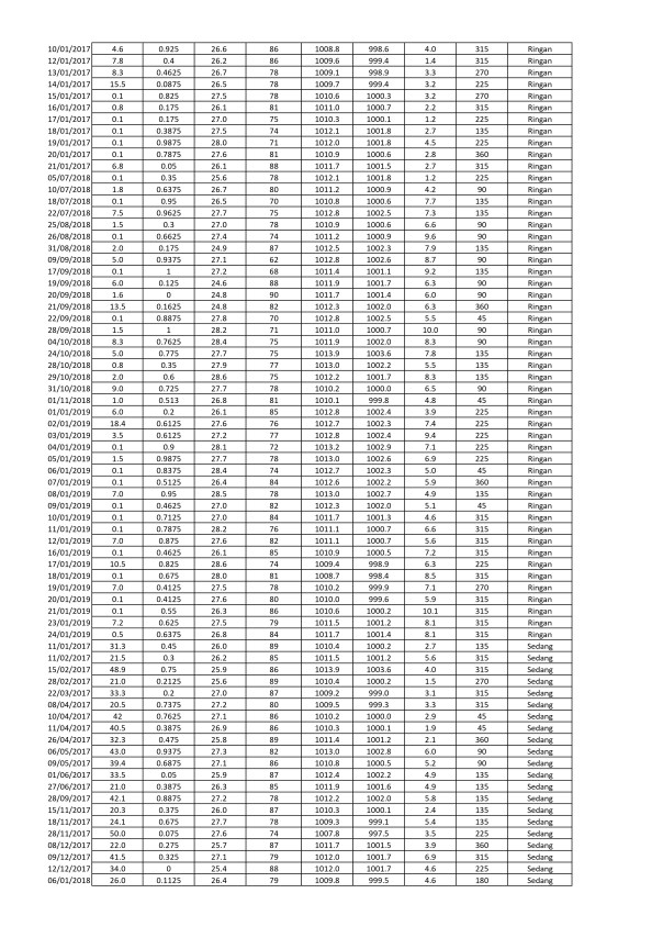 Untuk membuat model prediksi ini, kita akan menggunakan data cuaca dari tahun 2017 hingga 2019. Data terdiri dari: