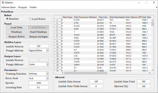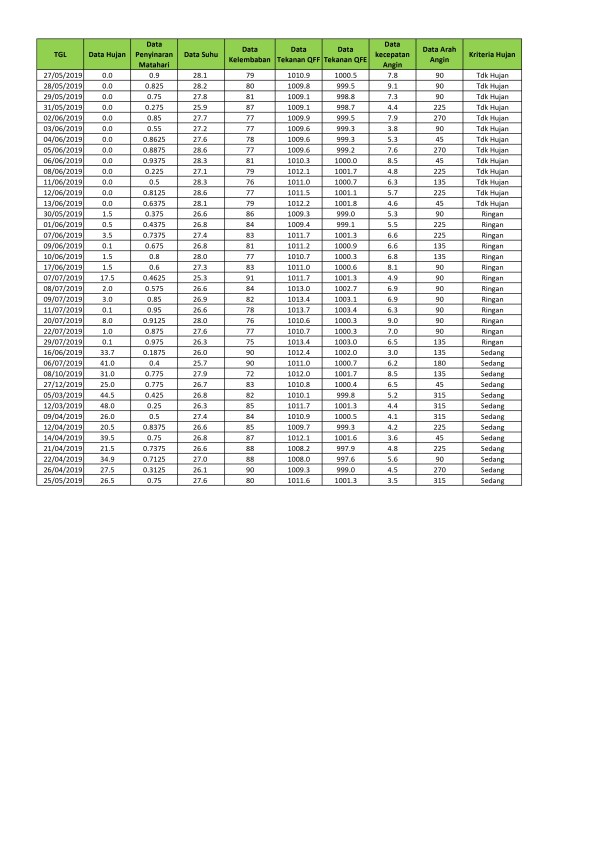 - Pelatihan dan Prediksi: JST dilatih menggunakan data latih dan kemudian digunakan untuk memprediksi kriteria hujan pada data uji.