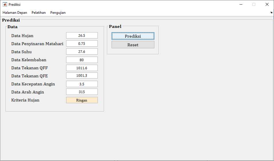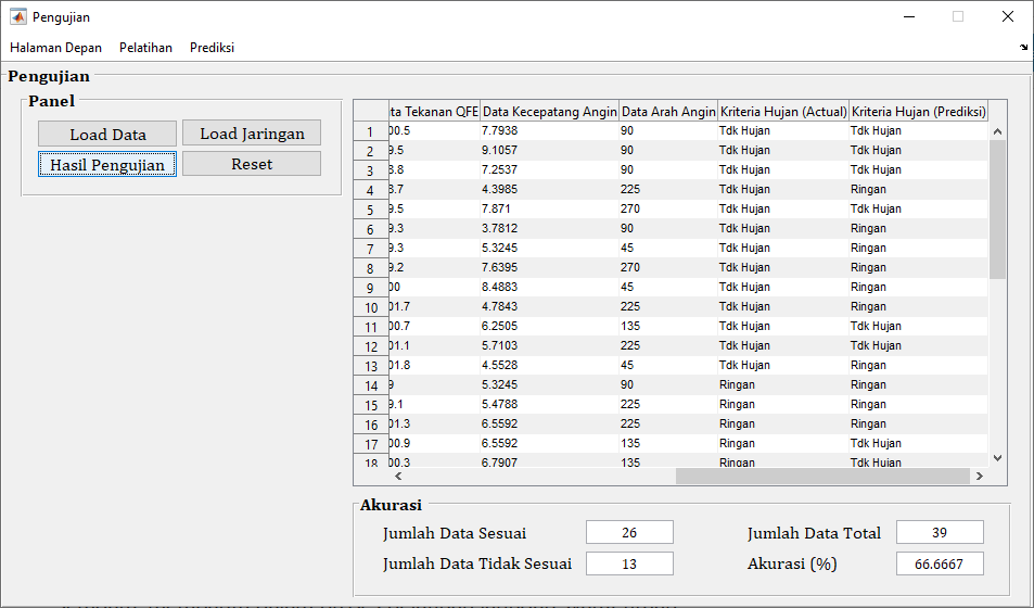- Pelatihan dan Prediksi: JST dilatih menggunakan data latih dan kemudian digunakan untuk memprediksi kriteria hujan pada data uji.