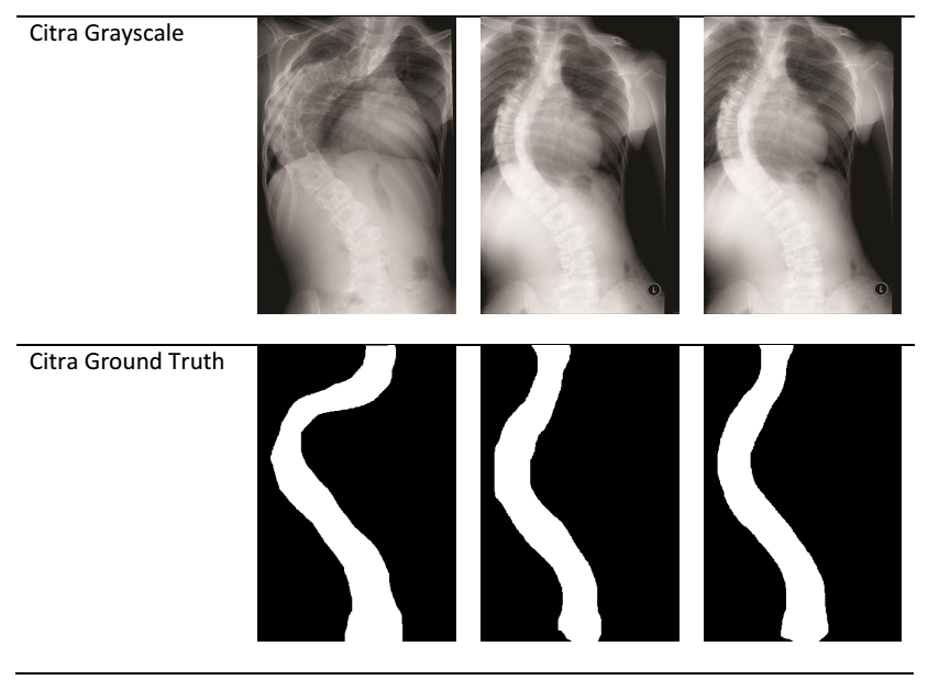 Dalam percobaan ini digunakan 15 citra rontgen berformat grayscale, masing-masing memiliki citra ground truth biner yang menandai area tulang belakang. Semua citra diubah ukurannya menjadi 450×300 piksel agar konsisten untuk pelatihan.