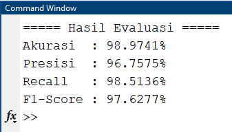 Pelatihan dilakukan selama 20 epoch menggunakan optimisasi Stochastic Gradient Descent with Momentum (SGDM). Selama proses pelatihan, akurasi model terus meningkat hingga mencapai lebih dari 99% pada epoch terakhir.