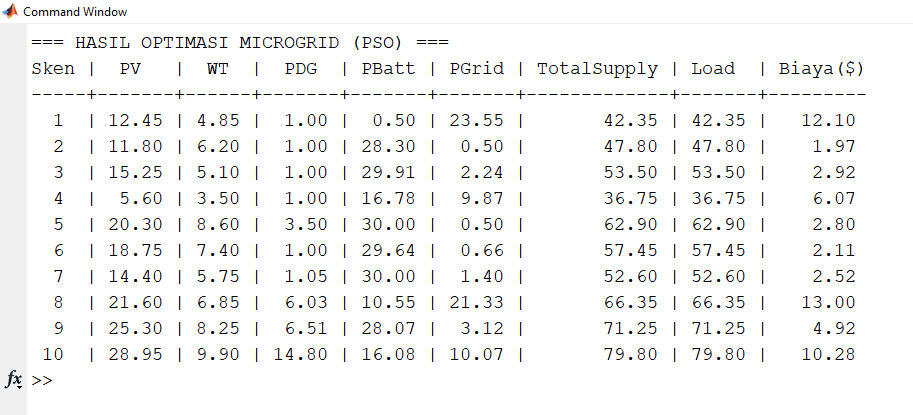 fprintf('Sken | PV | WT | PDG | PBatt | PGrid | TotalSupply | Load | Biaya($)\n');