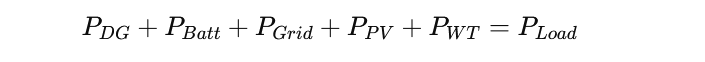 di mana cDG, cBatt, cGrid adalah biaya operasi masing-masing sumber, dan PDG,PBatt,PGrid adalah variabel keputusan yang dioptimasi.