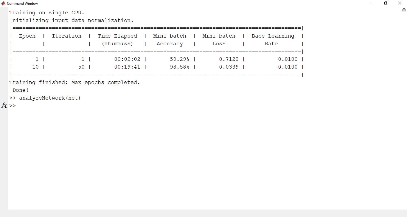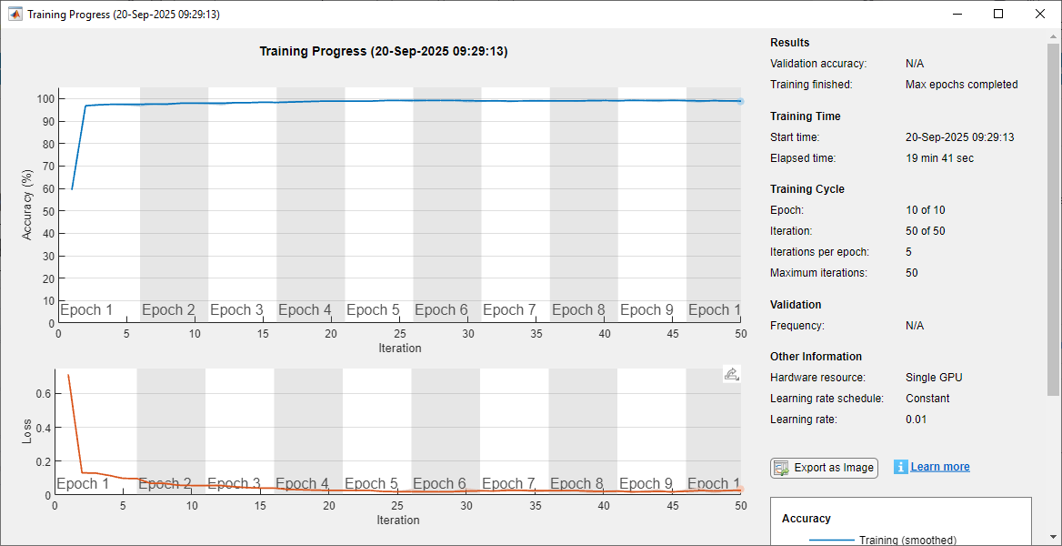 Proses training dipantau menggunakan training-progress plot untuk memastikan model konvergen dengan baik.