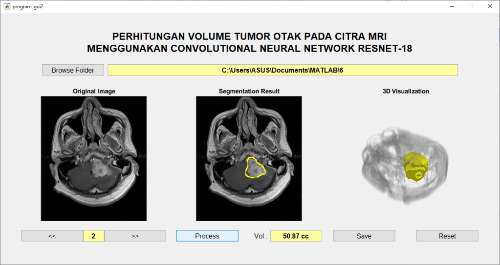 - Menyimpan hasil segmentasi, citra 3D, dan volume tumor ke file output