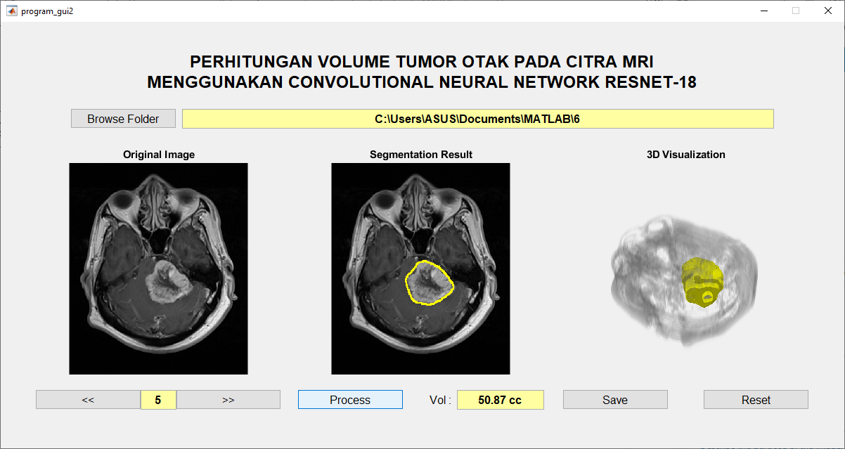 Penelitian ini mengimplementasikan metode semantic segmentation berbasis Convolutional Neural Network (CNN) arsitektur ResNet-18 pada citra MRI otak. Sebanyak 171 data citra DICOM beserta ground truth digunakan sebagai data latih untuk melatih model segmentasi. Sistem dilengkapi dengan antarmuka grafis (GUI) berbasis MATLAB yang mampu melakukan segmentasi otomatis, menghitung volume tumor, serta menampilkan visualisasi hasil dalam bentuk 2D maupun 3D.
