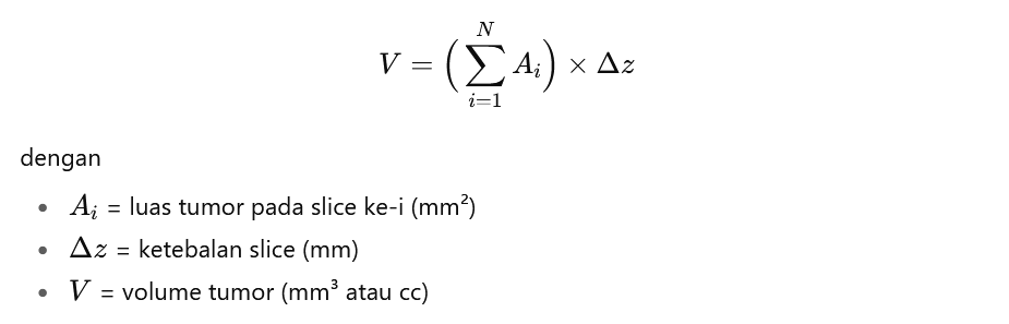 Volume dihitung berdasarkan jumlah piksel tumor, dikalikan dengan resolusi spasial citra (PixelSpacing) dan ketebalan slice (SliceThickness) dari metadata DICOM.