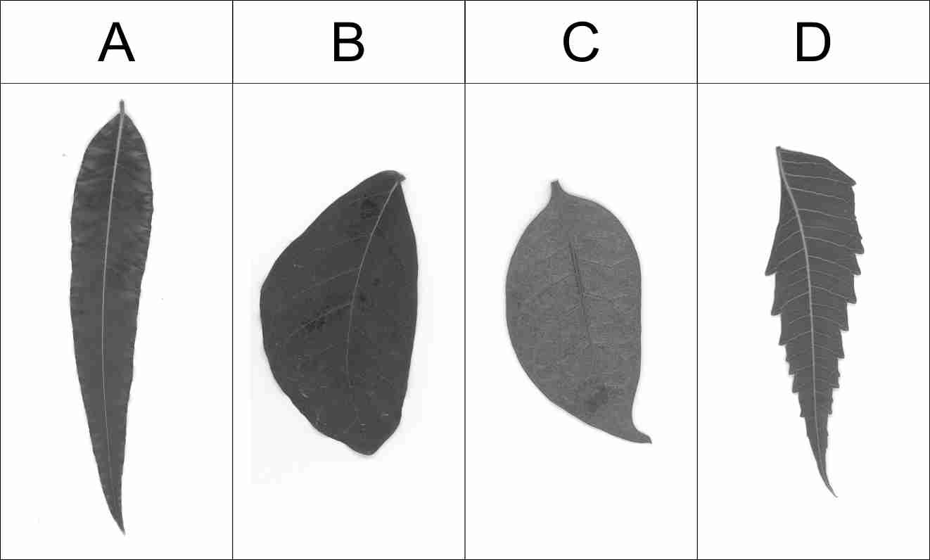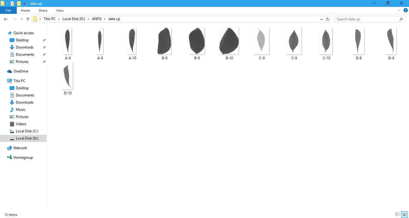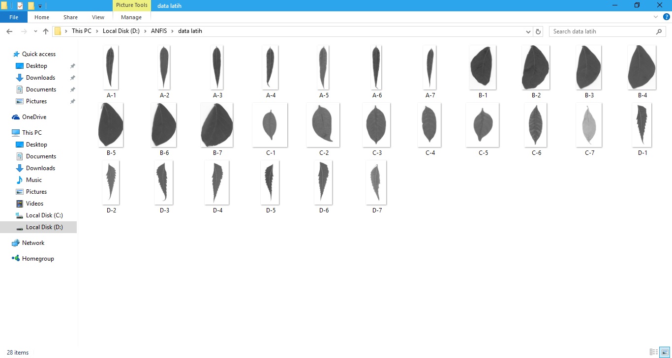 Berikut merupakan contoh aplikasi pemrograman MATLAB untuk mengklasifikasi citra daun ke dalam 4 buah kelas (A, B, C, dan D) menggunakan algoritma ANFIS. Pada contoh ini digunakan 40 citra daun yang terdiri dari 10 citra pada masing-masing kelas. Citra tersebut dibagi menjadi dua bagian yaitu sebanyak 28 citra untuk data pelatihan dan 12 citra untuk data pengujian. Contoh citra daun yang digunakan ditunjukkan pada gambar di bawah ini: