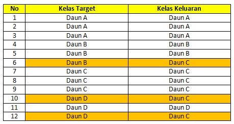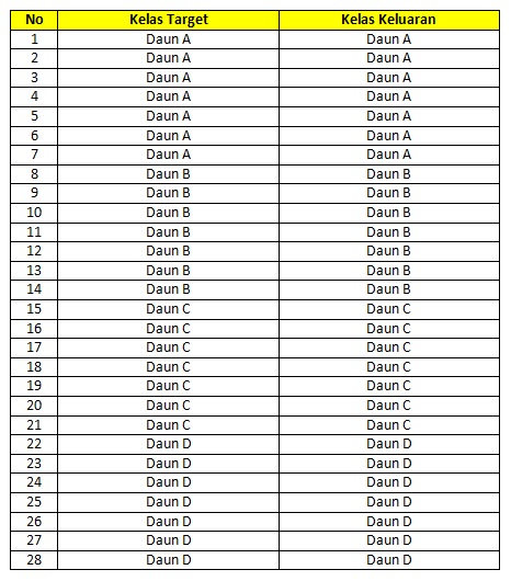 Pada tabel di atas tampak bahwa seluruh citra diklasifikasikan sesuai dengan target kelas yang sebenarnya. Sehingga diperoleh akurasi hasil proses pelatihan adalah sebesar 28/28*100 = 100%
