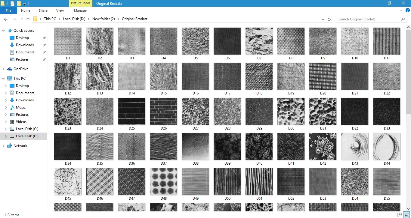 Berikut ini merupakan contoh aplikasi pemrograman matlab (menggunakan Matlab R2015b) mengenai pola tekstur citra menggunakan algoritma k means clustering dan naive bayes classifier. Citra yang digunakan adalah citra tekstur Brodatz sejumlah 112 buah seperti tampak pada gambar di bawah ini: