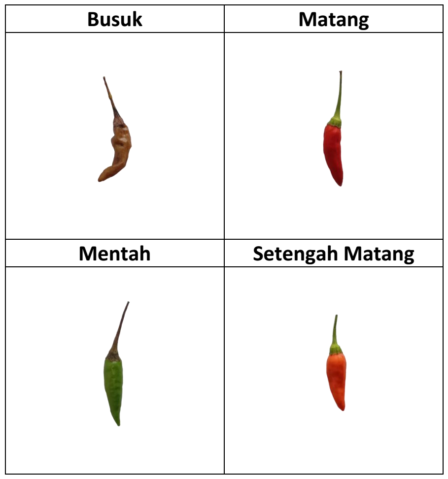 Cabai rawit (Capsicum frutescens) merupakan salah satu komoditas hortikultura yang memiliki peran penting dalam industri pangan. Penentuan tingkat kematangan cabai berpengaruh langsung terhadap kualitas produk dan nilai jual. Dalam praktiknya, sortasi cabai di lapangan masih banyak dilakukan secara manual oleh petani atau pekerja sortasi dengan mengandalkan penglihatan manusia. Metode manual ini rawan kesalahan karena faktor kelelahan, pencahayaan yang tidak seragam, serta perbedaan persepsi warna. Oleh karena itu, diperlukan sistem otomatis berbasis pengolahan citra yang mampu memberikan hasil klasifikasi yang konsisten.
