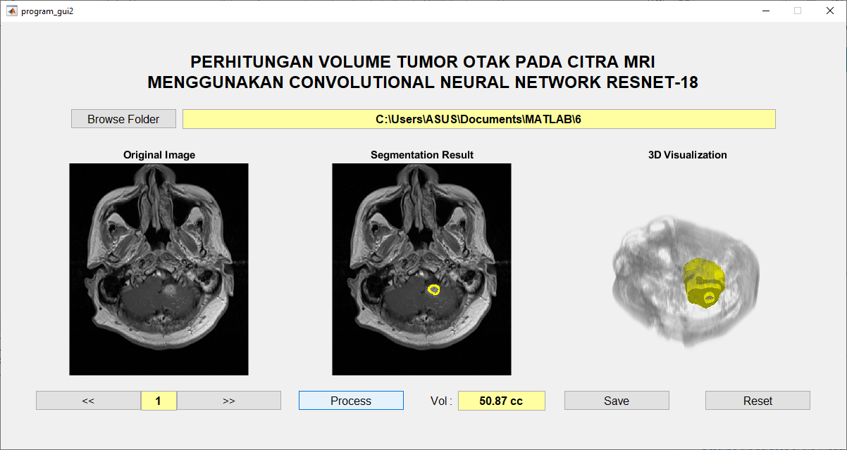 Penelitian ini mengimplementasikan metode semantic segmentation berbasis Convolutional Neural Network (CNN) arsitektur ResNet-18 pada citra MRI otak. Sebanyak 171 data citra DICOM beserta ground truth digunakan sebagai data latih untuk melatih model segmentasi. Sistem dilengkapi dengan antarmuka grafis (GUI) berbasis MATLAB yang mampu melakukan segmentasi otomatis, menghitung volume tumor, serta menampilkan visualisasi hasil dalam bentuk 2D maupun 3D.